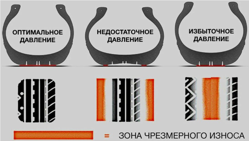 При избыточном давлении шина опирается в основном на центральную часть протектора, что приводит к ускоренному износу середины и снижает срок службы шины.